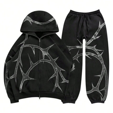 Black Thorn Print Tracksuit Set – Graphic Streetwear Hoodie & Joggers | Unisex 2-Piece đŸ–¤Â Full-length front zip hoodie đŸ–¤ Coordinated